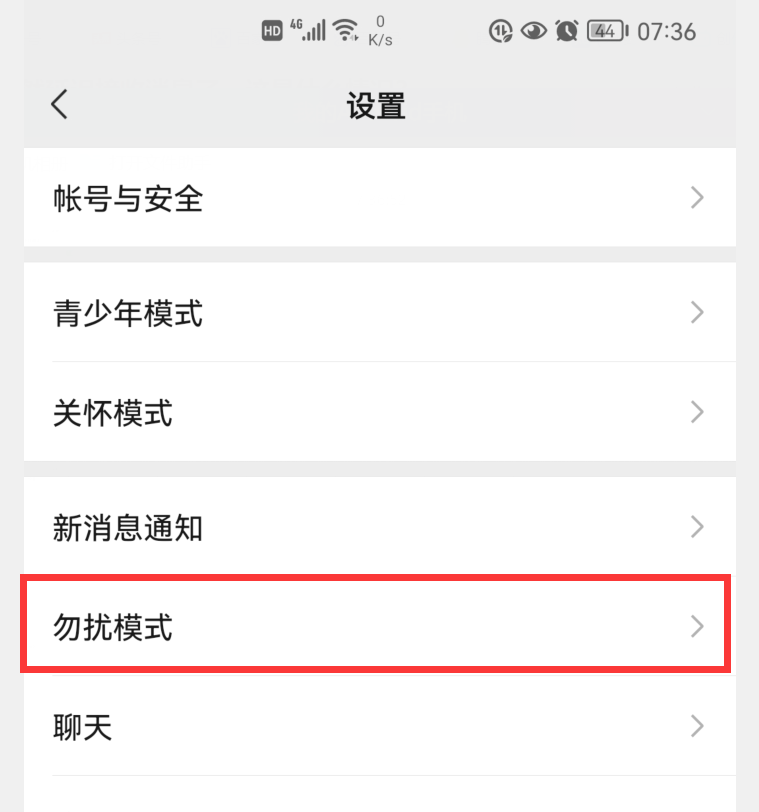 上图中的“勿扰模式”是开启的,我们可以修改它的开始时间和结束时间,来达到我们的目的,也可以直接点击“勿扰模式”右侧的开关,把它变成灰色,就关闭了“勿扰模式”。
