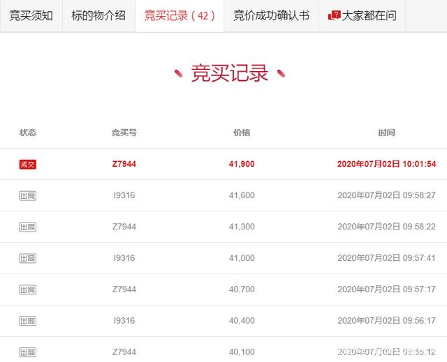 本次拍卖竞买记录42次出价,于 2020/07/02 10:06:54成交于竞买号Z7944的竞拍者,出价41900元夺得本次拍卖。