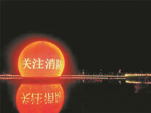 11月9日,安次区御龙河公园中心广场处,消防主题灯光秀准时上演,“关注消防 生命至上”的字样在人工湖中央的光球上滚动播放。