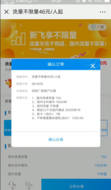 点击右下角的“立即办理”,然后点击“确认办理”,这样就为当前手机号办理了无限流量套餐98元