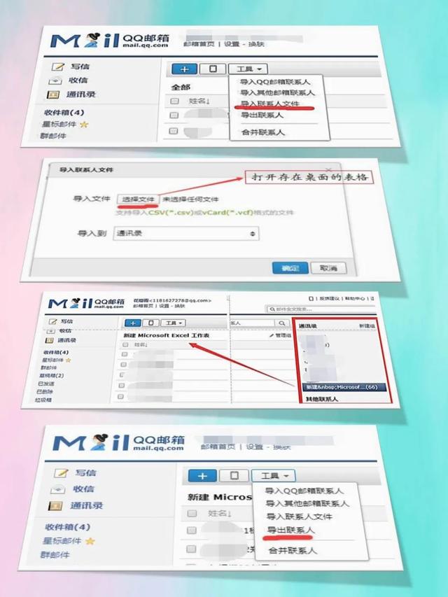 第二步:利用QQ邮箱把做好的表格格式转换一下,让csv格式转换成vCard格式。选择通讯录-工具-导入联系人文件;导入桌面文件后,在邮箱右侧通讯录列表点击刚导入完成的文件-再点工具-导出联系人-保存在电脑桌面。这里导入、导出是格式转换的关键步骤,请仔细看图操作!