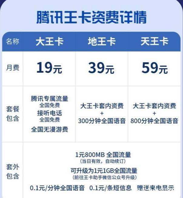 从上图我们可以看出腾讯的三种不同类型的王卡仅有"语音通话时间长短"的区别,其他套餐内容基本相同,超出套餐的流量和通话时长费用将按照1元/800M和0.1元/分钟的价格收取。