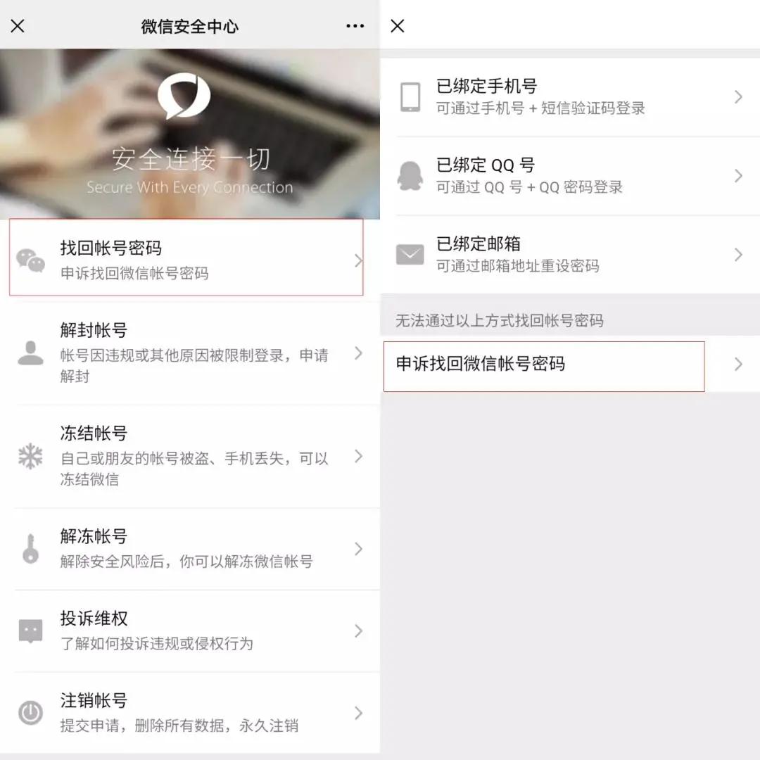 进入微信,找到【设置】-【账号与安全】-【微信安全中心】,可以看到【找回账号密码】。还有其他一些相关微信号的操作,如果你的微信出现相关问题,可通过这个步骤提示来解决。