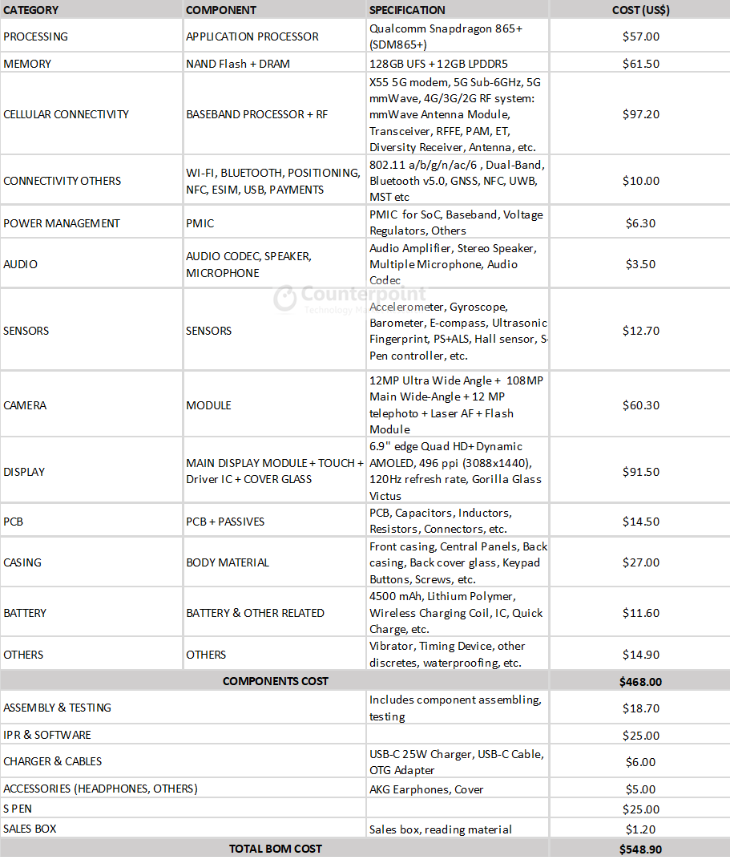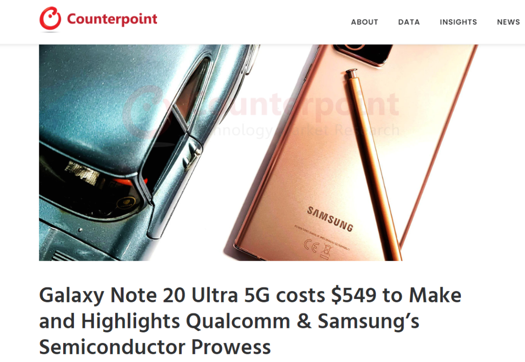 根据Counterpoint Research给出的详细表格报道来看,在三星Galaxy Note20 Ultra 5G的实际成本支出中: