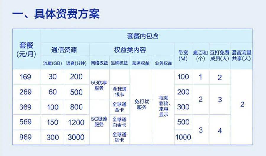 以上数据整理自广州某中国移动营业厅。中国移动营业厅提供的5G套餐内容和移动的网上营业厅提供的可办理的套餐出入还是比较大的,网上营业厅提供个人版和家庭版两个版本的5G套餐,套餐内容的差别可以对比上表和下图。