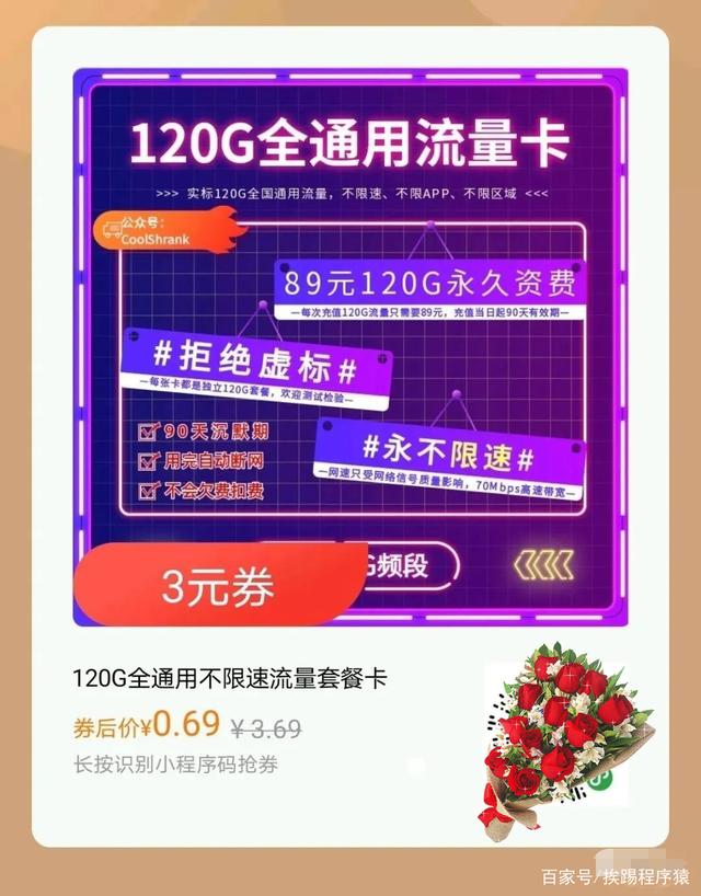 这是那阵子的活动内容,基本上就是支付6毛9就能把卡快递寄给你。流量套餐就是:充值89元,有120G流量,流量可使用3个月。流量从充值日期起,3个月清零。