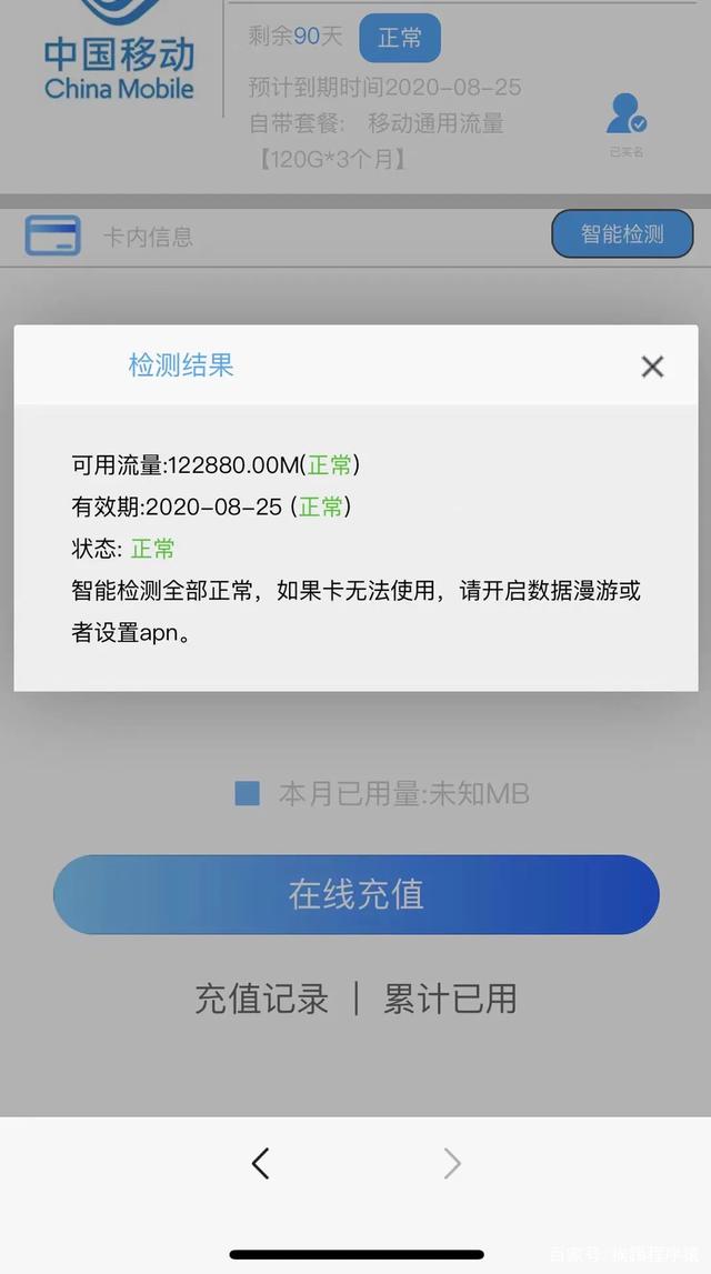 选择“智能检测”可以看到这张物联网卡的状态是否正常。