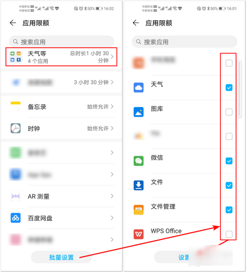 5、点击底部的【批量设置】按钮,选择需要设置的应用,点击【设置】按钮,可以批量设置应用的使用时间。