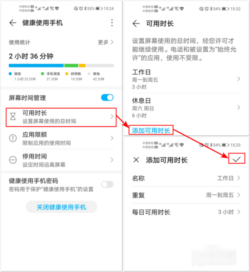 2、有三种管理手机屏幕时间的方式:可用时长。点击【可用时长】-【添加可用时长】,可以设置每天使用手机的总时间,设置好后点击右上角的【√】即可。