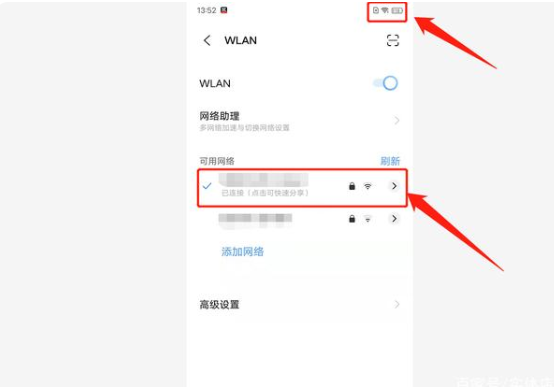 WLAN选项内会显示“已连接”的网络,且手机屏幕右上角会出现“WiFi连接“的标识,出现这个标识,就代表手机已经连接到了WiFi网络上。