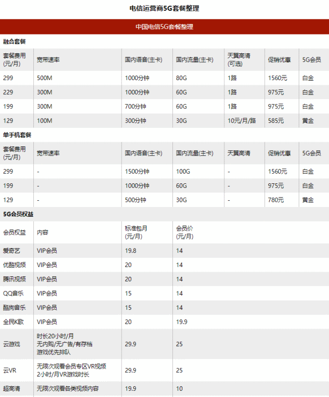 以上中国电信5G套餐数据整理自广州某电信营业厅,主要套餐内容分三种:融合套餐、单手机套餐以及商企套餐。其中融合套餐就是至包含手机套餐、宽带以及IPTV高清电视业务;单手机套餐就是我们所熟悉的、平常所说的包含多少流量多少通话时间的手机套餐;而商企套餐的话,主要的消费对象应该就是企业一类的了,会有其他的优惠活动。