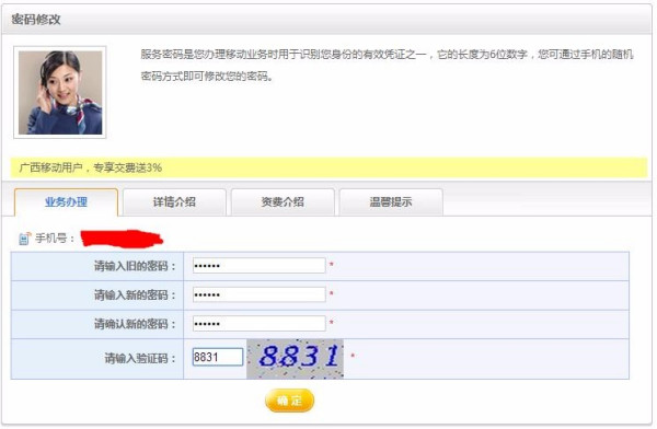 ⑤输入原始的服务密码、新的服务密码、图形验证码之后点击【确定】即可。