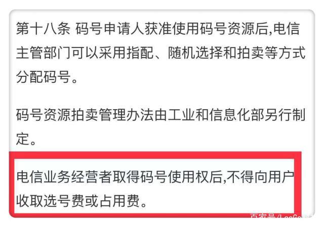 在《电信网码号资源管理办法》第18条规定:电信业务经营者取得码号使用权后,不得向用户收取选号费或占用费。