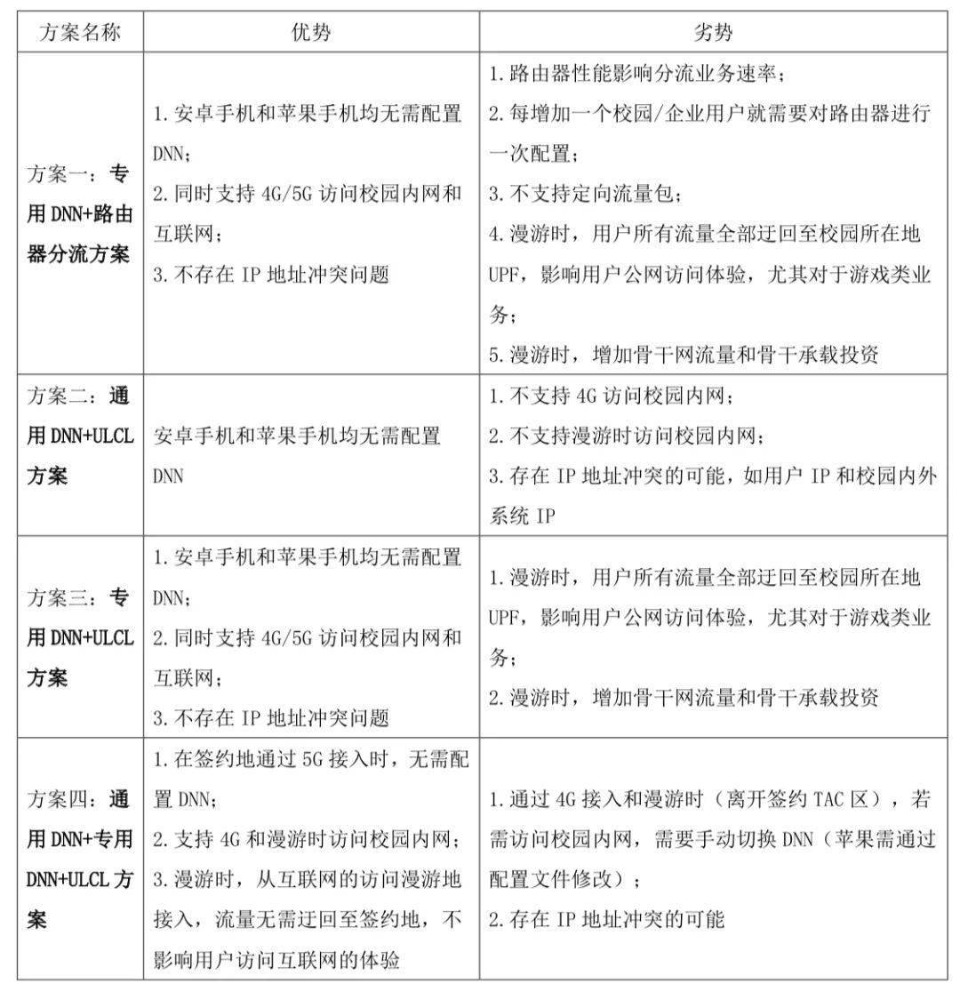 通过对以上4个校园专网方案优缺点的分析,推荐方案四作为校园专网的首选方案,该方案最大程度保证了校园专网用户(尤其是外地学生)漫游时访问互联网的业务体验,仅在需要访问校园内网时手动切换DNN。