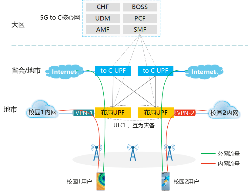 地市to C UPF或校园专用UPF需要经防火墙隔离后,才能通过专线连接至校园内网,以保障运营商5G网络的安全。