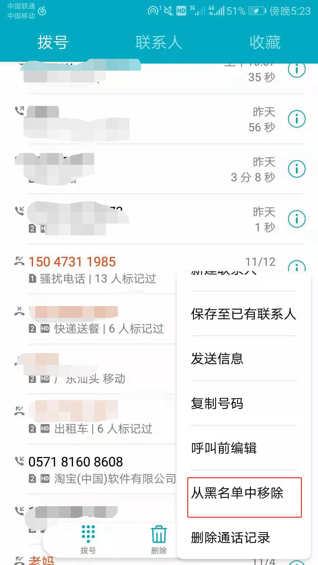4、你再长按那个骚扰号码,就可以在选择框里看见“从黑名单中移除”,表明他已经在黑名单里了。