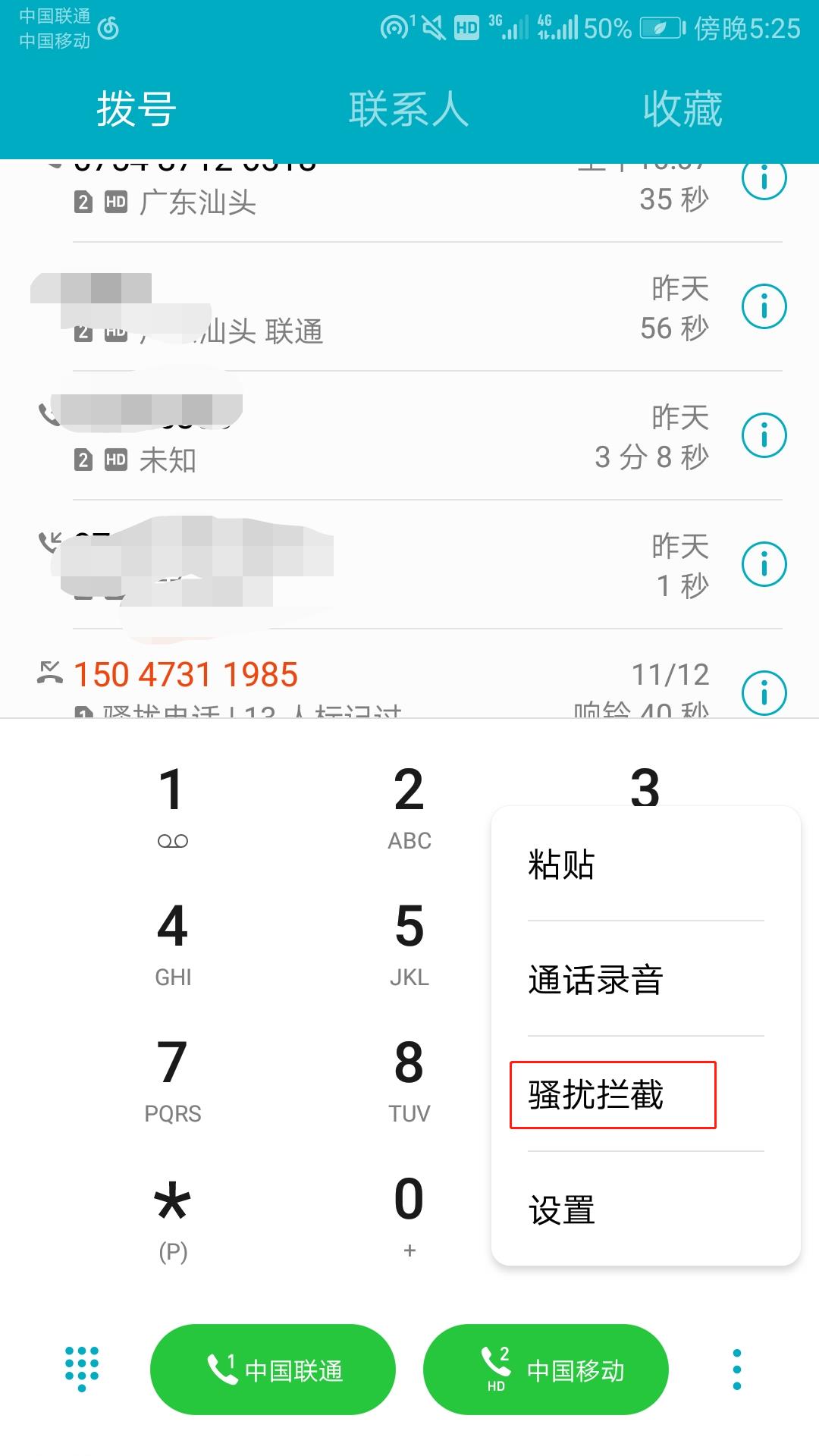 5、为了防止再被骚扰,可以按拨号键盘里的更多功能,跳出选择框,开始骚扰拦截功能。