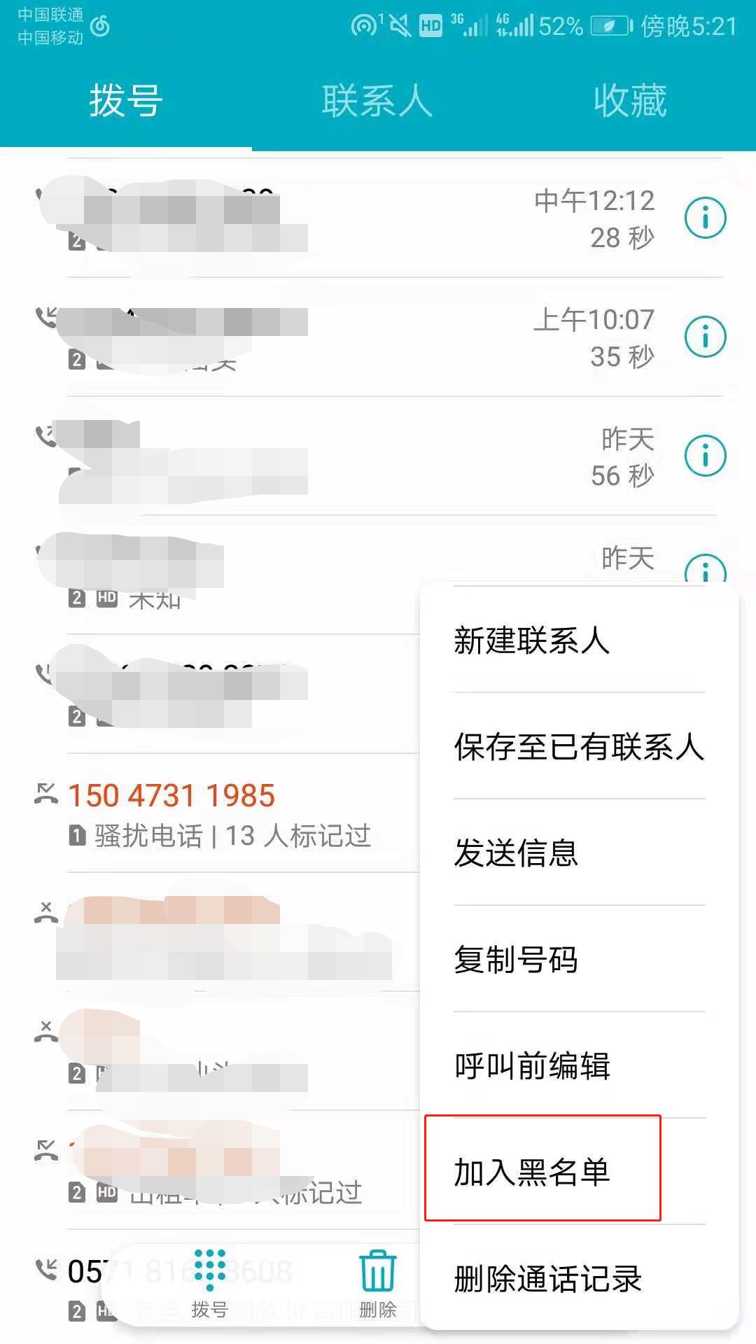 3、就会自动跳出一个选择框,下拉这个选择框,找到“加入黑名单”这个选项并点击就自动那该联系人加入了黑名单。