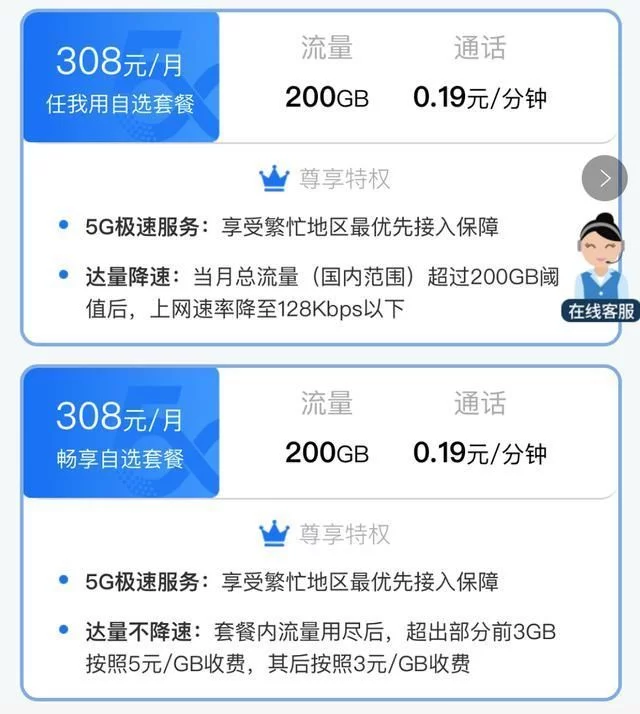 当然如果40GB不能满足你,还有208元每月100GB流量、308元每月200GB流量的5G套餐,但是请注意,158元套餐内明确写着,60GB流量用完后,超出的前3G流量按照5元/GB收费,之后3元/GB收费,这个价格就很贵了。
