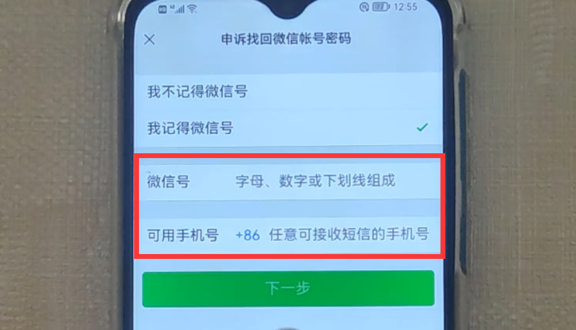 如果你不记得自己的微信号是多少,可以叫你的微信好友帮忙查看一下,然后告诉你就行了。这里的手机号可以是你自己的新手机号,也可以是你亲人或朋友的手机号,只是用来验证,不会绑定。填写好微信号和手机号以后,点击“下一步”,就会进入短信验证界面。