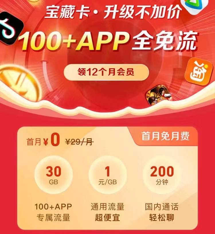 移动宝藏卡月套餐费29元,套餐内包含30G定向应用权益100 APP免流、5GB国内(不含港澳台)通用流量、3个亲情号码。