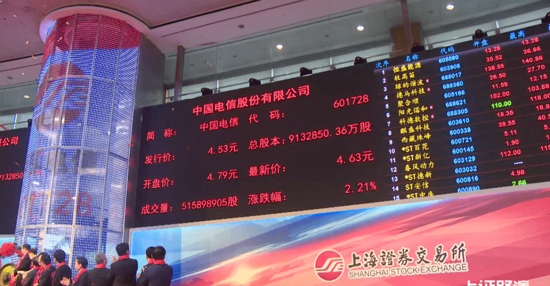 今日,中国电信在上交所开市祥锣,正式登陆A股市场。 据悉,中国电信发行价为每股4.53元,发行市盈率为20.18倍,开盘价为4.79元,最新价为4.63元,涨幅2.21%。