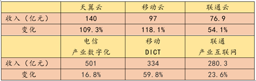 表3 三大运营商云收入及变化