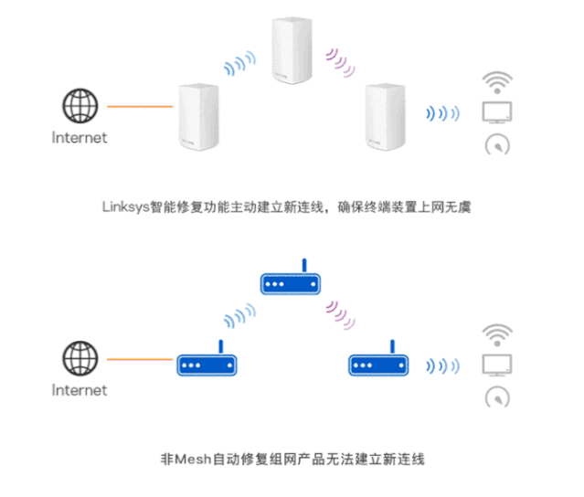 同时Mesh这张大网中,无论是发射端还是接入端都受到统一的管理,不仅SSID统一(也就是我们手机搜索到的无线信号),无线设备还可以自由寻找信号最好的节点去连接传输数据,用户手持设备在不同节点旁边穿梭时连接是无缝切换的。