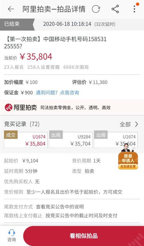 后经评估,该手机靓号价值为11380元。在网上拍卖过程中,多人争相竞拍,经过72次出价,最终以35804元的价格成功拍出,从而促进了案件的执行,取得了良好的法律效果和社会效果。