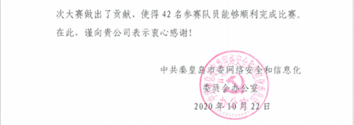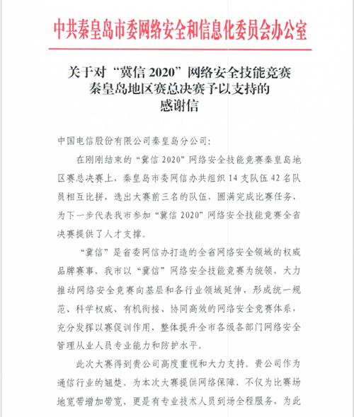 中国电信秦皇岛分公司圆满完成“翼信2020”网络安全技能竞赛保障工作获赞誉