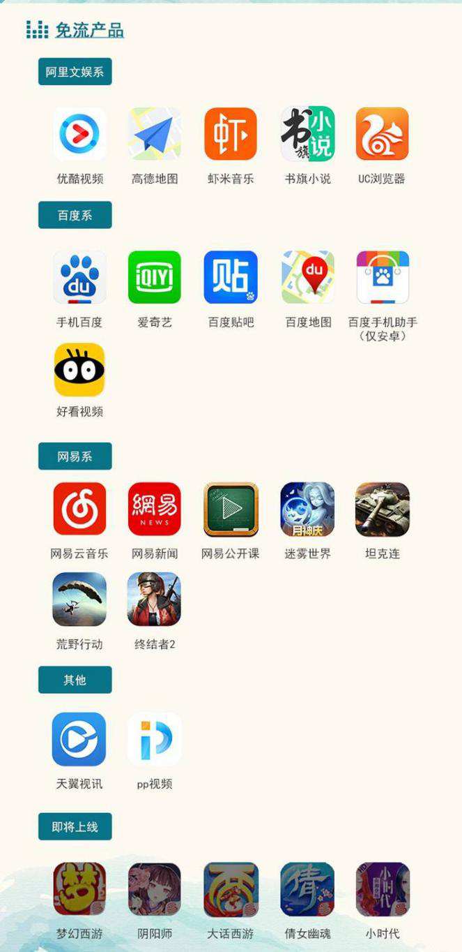 电信王卡最大的亮点莫过其免流范围。王卡支持阿里大文娱系、百度系、网易系、天翼视讯、PP视频(原聚力视频)等应用省内定向流量免费,阿里大文娱系应用包含优酷视频、虾米音乐、书旗小说、高德地图等;百度系应用包含爱奇艺、好看视频、手机百度、百度贴吧、百度地图、百度手机助手(安卓版)等;网易系应用包含网易云音乐、网易新闻、网易云课堂、网易漫画等;还有芒果TV、斗鱼直播、网易阴阳师等应用将陆续加入电信王卡免流行列。