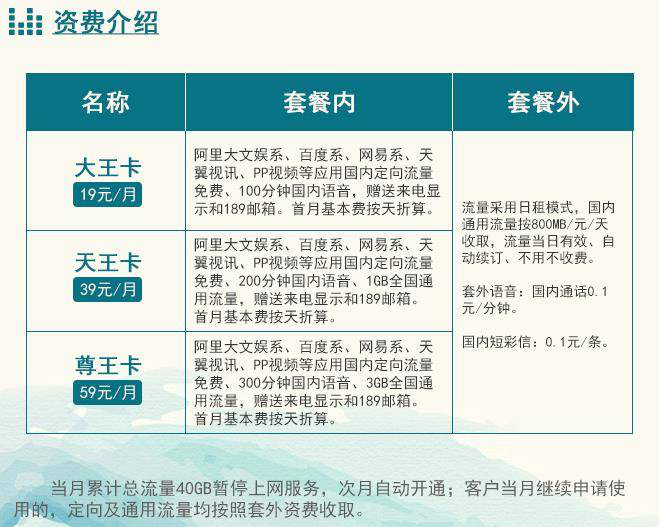 电信大王卡,套餐月费19元,套餐包括100分钟国内语音 阿里大文娱系、百度系、网易系、天翼视讯、PP视频国内定向流量免费。