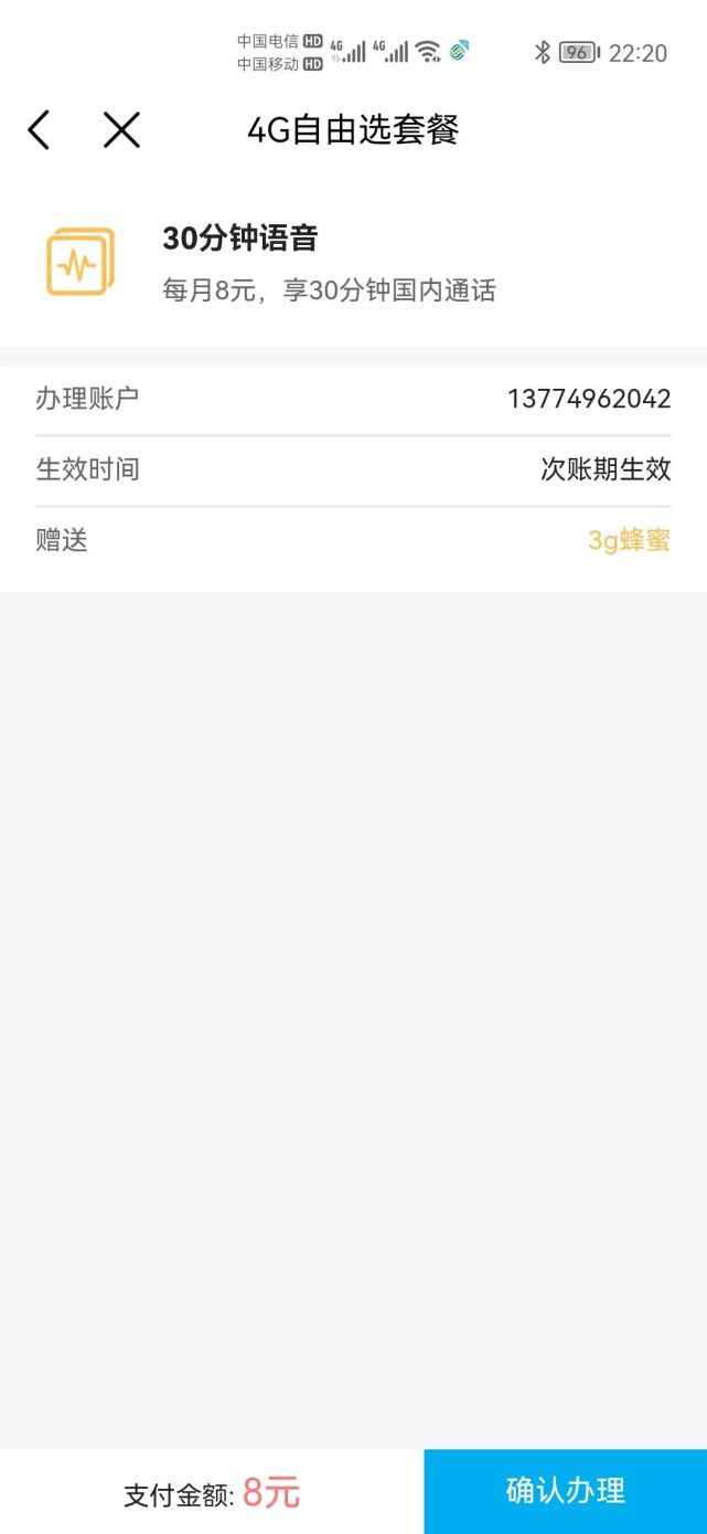 直接向客服说明更改为8元套餐,说明更改的套餐是“30分钟语音”套餐或者“100MB流量”套餐即可。