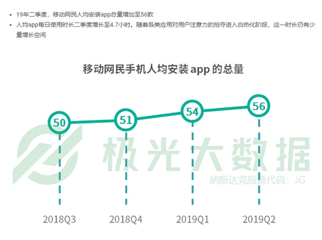据《极光大数据》2019年Q2移动互联网行业数据研究报告显示,在2019年第二季度,移动网民人均安装App总量增加到56款。另外也表明,平均每个人在56款使用了手机号码进行账号注册(可能有通过第三方登陆)。