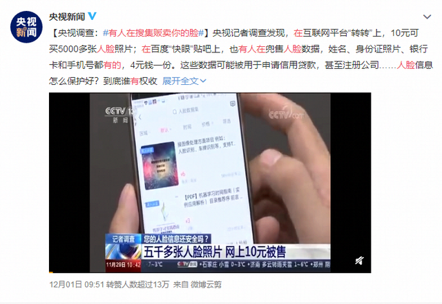 如果只是单纯的发送垃圾信息,这并不是最可怕的,最可怕的是个人信息被售卖。近日在微博热搜频频爆出,@央视新闻在12月1日报道只需花10元便可购买5000张人脸照片,另外还有姓名、身份证照片、银行账号以及手机号码。