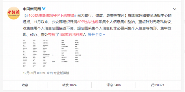 同时@中国新闻网在12月5日,报道了一侧新闻,主要内容是公安部组织开展App违法违规采集个人信息集中整治。多达100款App违规收集个人信息和超范围采集个人信息。