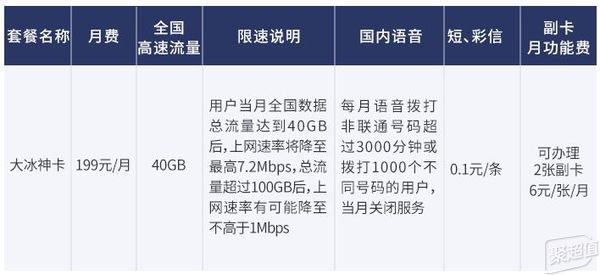 大冰神卡月租199元,可享40GB全国流量,超过的话上网速率将降至最高7.2Mbps。可办理2张副卡,6元/张/月,而且还是共享主卡里的流量的。