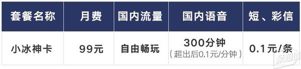 小冰神卡的月租是99元不限流量,超过20G上网速率将降至最高1Mbps,含有300分钟通话时间,适合需要通话套餐的人。
