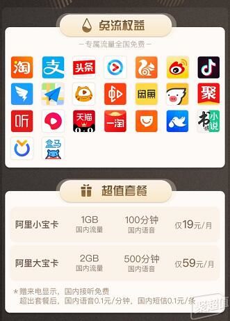 爱网购的聚友可不能错过阿里宝卡,打开支付宝搜索阿里宝卡即可办理,23款专属免流应用,分为阿里大小宝卡,小宝卡19元/月,1GB国内流量,100分钟国内通话时间;大宝卡59元/月,2GB国内流量,500分钟国内通话时间。