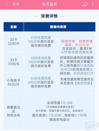 目前分为三个套餐:22卡,22元/月,2GB全国流量,100分钟国内通话时间;33卡,33元/月,3GB全国流量,100分钟国内通话时间;小电视卡,66元/月,5GB全国流量,300分钟国内通话时间。三个套餐的专属流量免费都含哔哩哔哩、哔哩哔哩漫画、新浪微博、百度贴吧、猫耳FM APP端,聚友们可以按照其他APP使用时间选择合适的流量套餐。