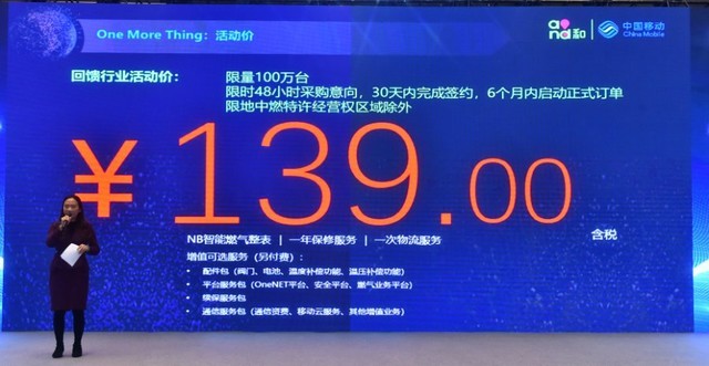 针对本次推介会,中移物联网及东发集团给出限量特别活动价格—总量100万套,“139元/套”。唐亚琼女士特别提到了139这个数字是对于中国移动的特殊意义。这个数字是中国移动开启移动数字通信时代的第一个号段。与这个特殊数字相对应的价格,表达了中国移动为客户提供从端到端,软硬件一体化完整服务的诚意,同时也强调了这个价格为“限时间、限地点、限数量”特惠价格,这个价格是中国移动和东发集团联合让利回馈燃气企业支持,表达了中国移动服务于燃气行业,为燃气企业赋能的真诚意愿。
