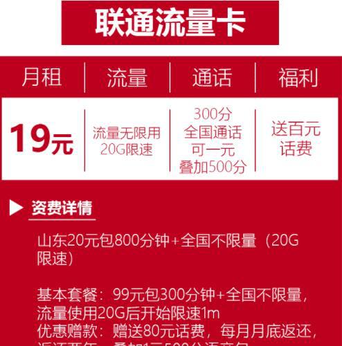 中国联通,是三家运营商中活动最多的一家,它信号方面的劣势导致很多用户不愿意选择联通,所以它只好把重心放在流量这一风口上,而没想到的是,流量众多物美价廉的套餐却为联通带来一大批的用户,其中最出名的就是“腾讯王卡”了,在推出一年的时间中,为联通增加了超一亿的用户,所以在此之后,联通也非常热衷推出各种套餐,而今天小编要说的,也就是山东联通的一款名叫“流量卡”套餐,接下来和笔者一起去看看吧。