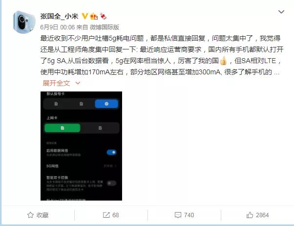 自从5G问世以来,很多人应该都听过5G基站耗能异常严重,但也许有很少人知道5G手机同样耗电严重。近日小米软件部高管张国全在微博上表示如果关闭5G功能那么将可以获得更佳的续航,证明了5G手机耗电严重。根据张国全表述,一般手机5G在网情况下比4G在网的能耗高出20%-30%。