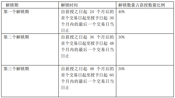 本次授予的限制性股票授予后满 24个月起为本计划的解锁期,在解锁期内,若达到本计划规定的解锁条件,激励对象获授的限制性股票分三期解锁: