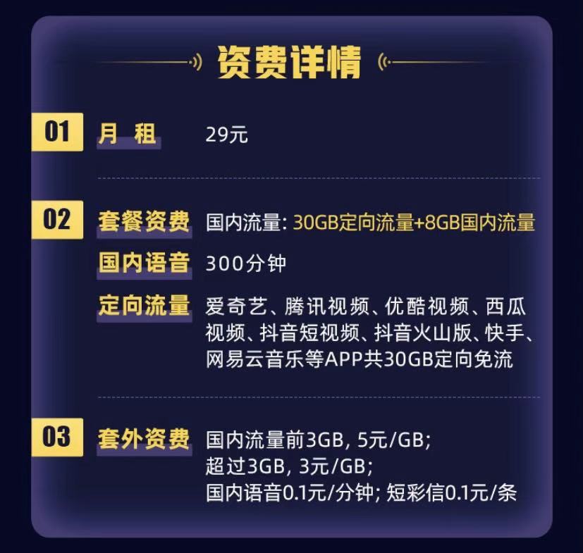 > 30G定向流量+8G国内通用流量,套餐外流量前3G国内流量5元/GB,超过3GB,3元/GB