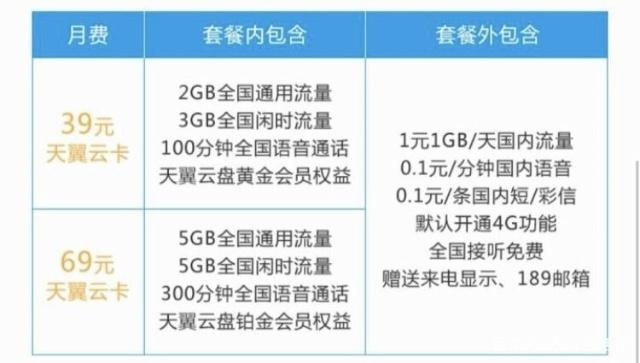 可以看到,套餐分为两种,一种是39元版,包含2GB的全国流量和3GB的闲时流量,所谓的“闲时”,其实就是每天23:00-7:00,另外还有100分钟的通话,以及4TB的云盘空间,1TB就是1024GB,4TB就是4096GB的储存空间,对于一般人来说完全够了。