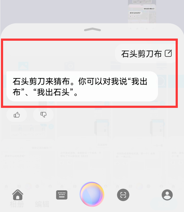 我们随便说”我出石头”或“我出布”,手机就会跟真的跟我们“石头剪刀布”玩起来了(如下图),是不是很有趣?