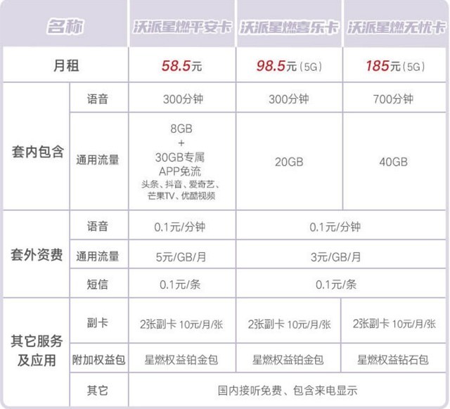 日前,中国联通宣布青年演员王一博成为中国联通品牌合伙人,与此同时还推出了一款名为“沃派星燃卡”的5G套餐,最低月费只需58.5元。据了解,“沃派星燃卡”分为三个档位,其中最便宜的为58.5元,其中包含8G通用流量、30GB专属APP免流以及300分钟语音,而且还可开通两张副卡,每月只需10元;第二档位是98.5元套餐,其包含语音300分钟,流量20GB,其他一样;185元的套餐是40GB流量,700分钟语音。