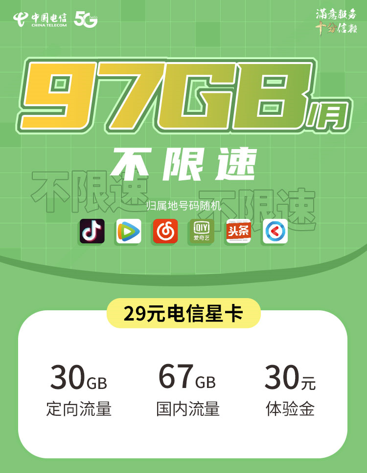 中国电信星卡29元套餐详情介绍:29元月享65G通用+30G定向+100分钟通话2022-05-28关键词: 中国电信星卡29元套餐 阅读(546)