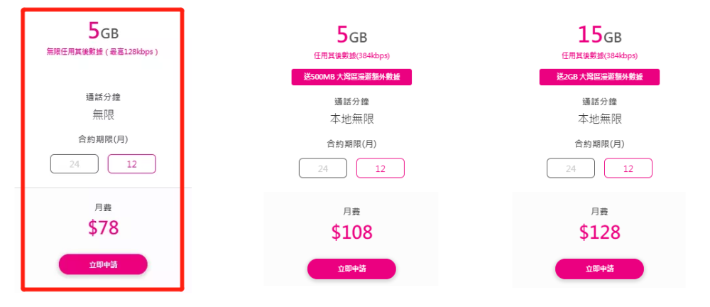 移动最便宜的套餐78港币每月,无限本地通话,学生计划免行政费,可签约1年或2年。但这个套餐的流量是限速的,比4G全速慢一些。如果要不限速的就是5GB流量,108港币一个月。
